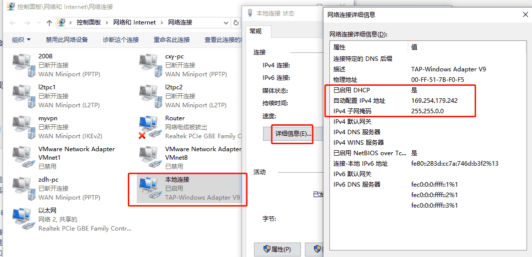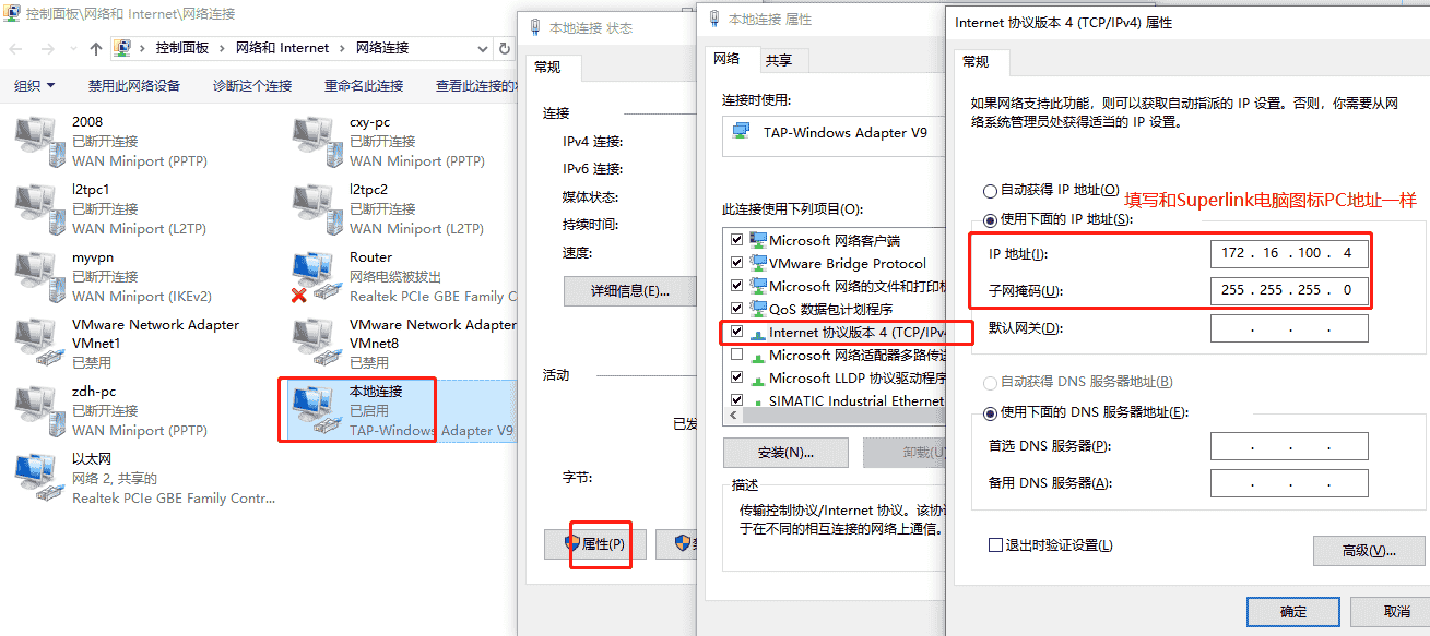 此时请检查一下电脑端TAP虚拟网卡,其IP地址是否异常切换为dhcp自动获取地址模式(地址为169.254.X.X的无效地址),如果是这种情况设置一下TAP虚拟网卡为静态地址,IP地址填写和Superlink工具上面PC电脑下面地址一致即可。 虚拟TAP网卡地址信息查看及修改成功后设备在线正常,分别如下图: